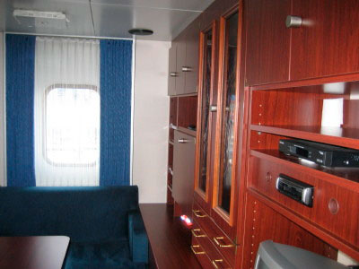 Zu den Kosten: 765 Euro pro Person, abgerechnet wird taggenau. Die Rücküberweisung für die bei uns nicht genutzten drei Tage kam prompt und ohne jedes Problem. Die Vorabinfos des Vermittlers waren gut, im Internet gabs auch genug Reiseberichte etc. Soweit die Vorgeschichte. Wir haben uns also ins Auto gesetzt, von Winnemark nach Hamburg dauert es je nach Verkehrslage zwischen knapp zwei und sechs Stunden. Wir sind mit genug Reserven losgefahren, deswegen gab es keinen Stau und sonst was. Nur mein Navi war mit der Streckenführung am Containerterminal Altenwerder ziemlich überfordert. Immerhin waren wir gut eineinhalb Stunden vor dem Anlegen unseres Schiffes am Pförtner des CTA. Die erste Auskunft dort: nee, die Henneke Rambow kommt hier nicht hin. Zweite Antwort (nach leichter Intervention): Doch, sie kommt, wir sind sogar angemeldet, nur wann sie kommt?? Wir wurden zu der Bushaltestelle des Shuttle-Busses verwiesen, ein Parkplatz fürs Auto fand sich ganz in der Nähe auf einem Parkstreifen. Nach der ersten Stunde warten bin ich wieder zum Terminal-Pförtner, dort sah man sich völlig ausserstande, mal nachzuhören, wo die Henneke denn bleibt, Theoretisch sollte sie ja schon seit 15 Uhr angelegt haben. Die Frachter-Telefonnummer war nicht zu erreichen, also mal beim Vermittler nachgefragt. Dort kam relativ prompt die Antwort, dass wir wohl so gegen 16 Uhr an Bord könnten. Und so war es dann auch. Der kleine Bus brachte uns quer durch das Containerterminal direkt vor das Schiff, ein nettes Besatzungsmitglied begrüsste uns, schnappte sich die beiden Reisetaschen und schon waren wir die auf dem Weg nach oben. Nach vier Stockwerken und gefühlten 200 Stufen (in Wirklichkeit wohl nur um die 50) öffnete sich die Tür zur Kammer, hinter der sich eine richtige kleine Wohnung verbarg. Auf den Kreuzfahrern heisst die Grösse sicher Suite mit Aussenbalkon. Hier ein paar Bilder: