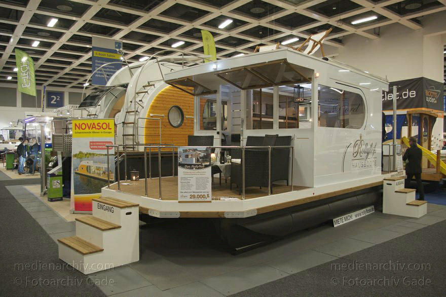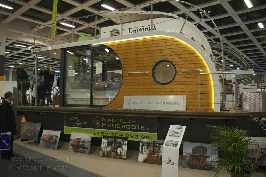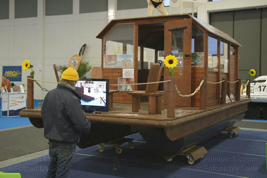 Auf den ausgestellten Hausbooten, beispielsweise von Nautilus, wurde den interessierten Besuchern Sekt gereicht. Diesmal hatten mehrere Anbieter ihre Hausboote nebeneinandergestellt. Wer auf den Binnengewässern Berlins, Brandenburgs und Mecklenburg-Vorpommern mit einem bequemen, platzmäßig großzügigen und einigermaßen preisgünstigen Fahrzeug auf dem Wasser Zeit verbringen mochte, konnte hier interessante Anregungen bekommen. Ein luxuriöses Hausboot mit Vollausstattung kostete ca. 100.000 €,während eine schlichter gehaltene Variante mit 40.000 € zu Buche schlug und rustikale Versionen im Bretterhüttenstil waren für die Hälfte erhältlich. Ein Hausboot bestand grundsätzlich aus vier wesentlichen Elementen. Erstens den Auftriebskörpern, zweitens der Plattform, drittens der Hütte und viertens der Antriebs- und Steuertechnik.