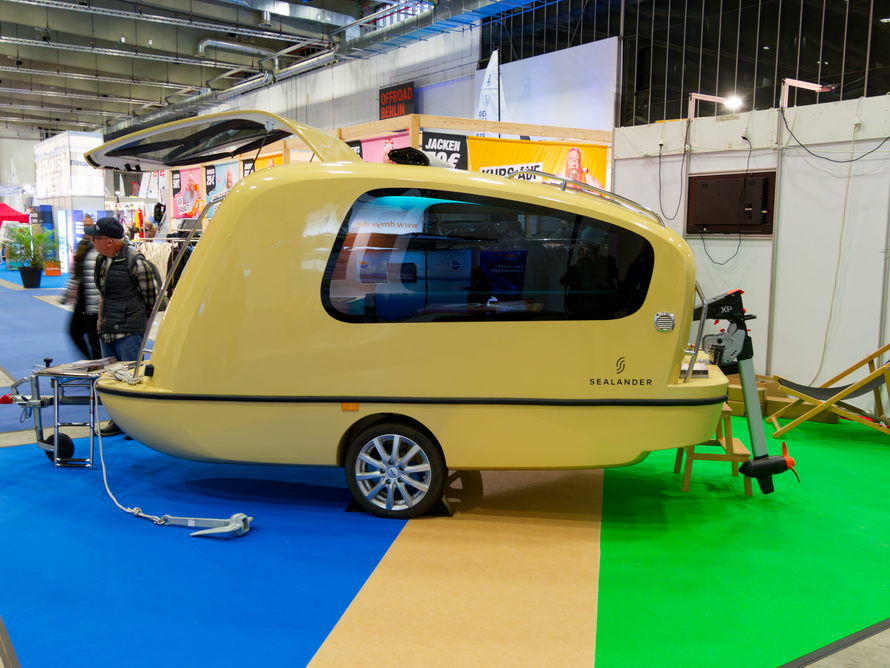 Der Sealander ist Wohnwagen mit einem Gewicht unter 750 kg und Motoboot der Kategorie D zugleich. Die Länge des Rumpfes ohne Deichsel beträgt 3,95 Meter. Das ist u.a. ein interessantes Produkt für Naturfotografen, die sich für die Flora und Fauna an Binnengewässern interessieren. Die Basisversion kostet knapp 40000 €. Das ist kein Schnäppchenpreis. Der E-Außenborder muss extra gekauft werden. Sicher genutzt werden kann der Sealander nur bis 0,3 Meter Wellenhöhe oder höchstens 0,5 Meter, wenn ein vorbeifahrendes Schiff sie erzeugt. Die vordere Klappe sollte man in Fahrt nur bei glattem Wasser öffnen.