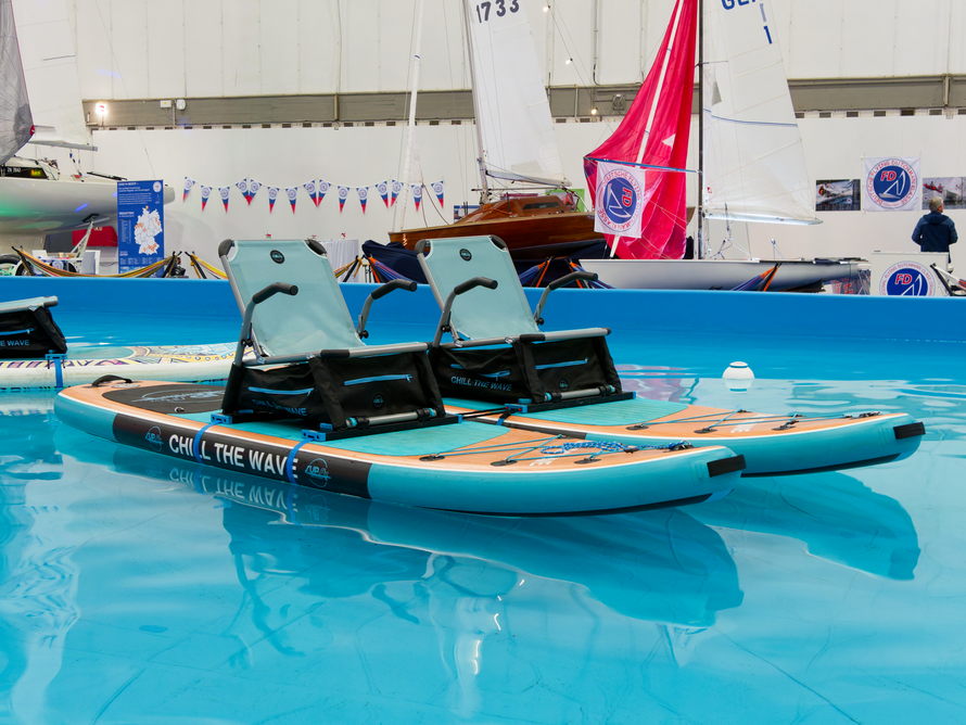 Danach kam die Wassersporthalle mit einem großen Becken, auf dem drei SUPs mit montierten Sitzen trieben. Doch niemand probierte etwas aus oder führte etwas vor. Am Donnerstagvormittag nach der Galanacht hätte ich das verstanden, aber am Freitag gegen Mittag? Auch ein Tauchcontainer fehlte, und insgesamt wirkte die trüb beleuchtete Halle wie ausgestorben.