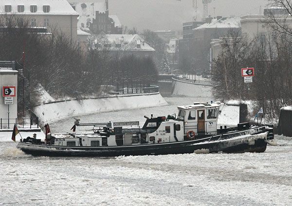 2010 / 2012 © Thomas Gade30. 12. 2010. Berlin. In diesem Jahr hat der Winter früh zugeschlagen. Es ist bitterkalt und die Gewässer sind zugefroren. Die Boote der Freizeitkapitäne ruhen saisongemäß in ihren Winterlagern. Die Berufsschifffahrt wurde von dem frühen und heftigen Wintereinbruch gestoppt. Auf dem Berlin-Spandauer-Schifffahrtskanal transportieren Binnenschiffe die Kohle zum Kraftwerk Moabit. Bei geschlossener Eisdecke ist dies nicht möglich. Das Wasser und Schifffahrtsamt setzt den Eisbrecher Seelöwe der Berliner Schifffahrtspolizei ein, um die Eisfläche auf der Binnenwasserstraße in Stücke zu schlagen. Die Strömung soll die losen Schollen aus dem Kanal treiben, damit der Kohletransport gesichert werden kann.