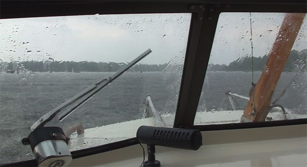 Es sollte eine Fahrt nach Werder werden. Kurz vor der Glienicker Brücke fielen die ersten Tropfen. Na ja, das wird gleich aufhören, dachten wir. Der Wetterbericht hatte im schlimmsten Fall einige mäßige Schauer vorhergesagt. So dicht sahen die Wolken auch nicht aus. Unter der Glienicker Brücke hatten einige Sportboote aufgestoppt und verharrten in der Nähe der Pfeiler. Hier waren sie vor dem Regen geschützt. Wir fuhren mit sehr langsamer Fahrt (2 Knoten) weiter. Der Regen nahm zu. Längst brannten unsere Navigationsleuchten. Allmählich merkten wir, dass es sich hier nicht um ein kurzzeitiges Ereignis handelte. Das Verdeck bot Schutz, aber an den offenen Seiten kam allmählich reichlich Wasser ins Boot. Die Seitenteile wurden eingehängt, was die Sicht nach achtern durch die regennassen transparenten Folien erheblich verschlechterte. Kanus und Ruderboote mit klatschnassen Insassen kamen uns durch den Regenvorhang entgegen. Erstmals kamen unsere alten Scheibenwischer mit ihren abgenutzten Blättern zum Einsatz. Erstaunlicherweise erwiesen sie sich als äußerst hilfreich. In diesem Revier kann man sich im Sportboot mit 0,65 Meter Tiefgang glücklicherweise weit außerhalb der Fahrrinne aufhalten, was wir taten, um aufkommenden Fahrgastschiffen nicht im Wege zu sein. Durch die schlechte Sicht nach achtern hätten wir sie möglicherweise zu spät bemerkt.