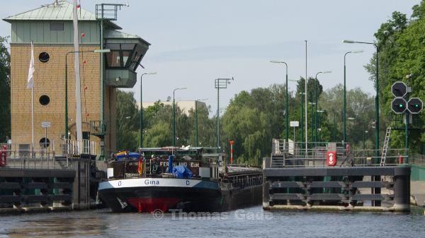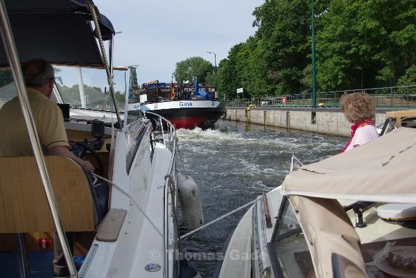 Thomas Gade © Mai 2012Auf der Fahrt vom Wannsee bis Pichelswerder sahen wir nur wenige Binnenschiffe auf der Havel. Indes waren bei dem guten Wetter allerhand Sportboote auf dem Wasser. An den bekannten Stellen vor den Vereinen tummelten sich die Segelboote. Nach der Einfahrt in die enge kanalisierte Havel, die entlang begrünter Ufer, versteckten Marinas und Industrieanlagen durch Spandau zur Schleuse führte, waren die Motorboote unter sich. Dass wir Pfingstsonntag nicht alleine durch die Schleuse Spandau fahren würden, war klar. Unweit der Schleuse sichteten wir voraus ein fahrendes Binnenschiff. Wir schätzen seine Länge auf ca. 85 Meter, was ungefähr zutraf, und die Hoffnung auf eine schnelle Schleusung weckte, falls nicht zuviele Sportboote in Warteposition lagen, oder ein Fahrgastschiff aufkam. Auf beiden Seiten vor der Schleuse befanden sich Parkplätze für Sportboote, die hindurch wollten. Mit uns waren es insgesamt 10 Boote.