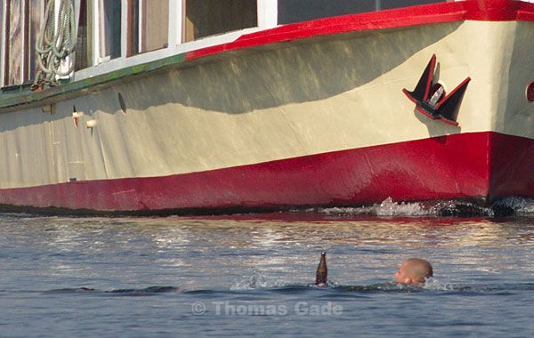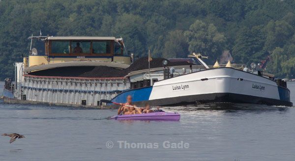 Thomas Gade © Juli 2012Der Führer des Binnenschiffs staunte nicht schlecht. Ein Kajak bewegte sich zielstrebig in Richtung der Fahrrinne. Die Insassen nahmen keine Notiz von dem sich nähernden Schiff, welches eindeutig das Stärkere war und nicht zu stoppen gewesen wäre. Das energische Betätigen des Horns klärte die Situation. Nach einem Blick über die Schulter beschloss der Paddler den Kurs zu wechseln. Ohne Zweifel war das eine weise Entscheidung. Offenbar hatte der urplötzliche Hitzeeinbruch das Verhalten der Wassersportler an diesem Tag beeinträchtigt, denn es sollte nicht der einzige Vorfall dieser Art bleiben.