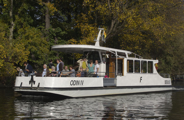 Hier ist die kleine Personenfähre Odin IV unterwegs, die kurze Distanzen zwischen den gegenüberliegenden Ufern der Havel auf Tegeler und Spandauer Seite und der Insel Valentinswerder zurücklegt. Sie verkehrt am Wochenende für die Ausflügler, die entweder ein bestimmtes Ziel haben oder eine Rundfahrt mitmachen. Für die Bewohner, Dauercamper und Wochenendhausbesitzer auf der Insel Valentinswerder ist die Fähre eine wichtige Verbindung zum Festland, denn es gibt keine Brücke.