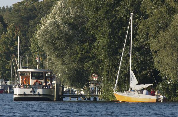 Die Fähre Odin IV am Anleger 'Tegelort'. Vom Tegeler See kommt ein Segelboot, das die Fähre erst spät zu sehen bekommt.