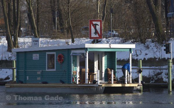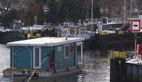 Thomas Gade © April 201326. 3. 2013. Berlin. Der Winter will nicht weichen. Die tagsüber schon kräftige Sonne läßt den Schnee auf den Autodächern schmelzen. Auf den schattigen Seiten erreicht das kühle Schmelzwasser den Boden nicht und bildet lange transparente Eiszapfen. Die Boote liegen noch an Land. Die Wassersportsaison scheint in weiter Ferne zu liegen. Überraschenderweise liegt an der Wartestelle für Sportboote vor der Schleuse Spandau im Berlin-Spandauer-Schifffahrtskanal ein Hausboot. Die Lichtzeichen an der Schleuse schalten um auf Grün. Auf dem Boot begibt sich ein Mann zum Steuerrad; ein anderer hantiert mit Leinen. Das Hausboot legt ab. Der Schnee am Ufer bildet einen seltsamen Kontrakt zu den hölzernen Gartenmöbel und dem Grills auf dem vorderen Deck.