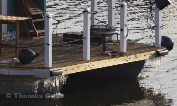 Wer trotzt der Kälte? Eine typische Hausbootfahrt scheint dies nicht zu sein, eher eine Überführungsfahrt eines neuen schwimmenden Bungalows, bereit zum Chartern. Der Rudergänger sitzt dick eingepackt im Freien. Gemütlich dürfte diese Fahrt bei der Kälte nicht sein. An der Bootspitze sind zahlreiche Eiszapfen, die deutlich machen, wie kalt das Wasser ist.