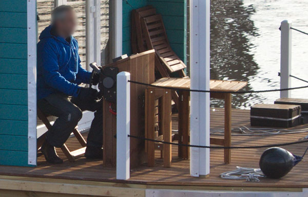 Der Mann auf dem Achterschiff lehnt sich seitwärts vom Boot weg und vertraut auf die Festigkeit des mit der Hausbootwand verschraubten Griffs, an dem er sich festhält. Ja, die Konstruktion macht mit! Das Hausboot ist solide gebaut. Langsam fährt das schwimmende Ferienhaus in die Schleusenkammer. Auf dem Dach des Hausbootes ist ein Schornstein zu sehen. Die Räume sind gut isoliert und ein Kamin sorgt im Bedarfsfall für wohlige Wärme.