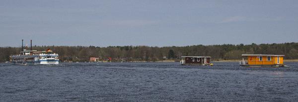 Thomas GadeAuf der Havel in Berlin fahren zwei Hausboote nebeneinander. Zwischen ihnen befindet sich ein Kajak. Ein Blick durch das Fernglas zeigt, dass die Leute an Bord den Tag ruhig angehen lassen und gemütlich im Verband unterwegs sind. Die Sache hat einen Schönheitsfehler, wie wir von unserem Boot aus erkennen können. Hinter den Hausbooten kommt allmählich der Ausflugsdampfer MS Havel Queen auf, 67 Meter lang und 9 Meter breit. Die Leute an Bord der Hausboote blicken nach vorn. Der Schiffsführer der MS Havel Queen, ein Fahrgastschiff der ‘Stern und Kreisschiffahrt’ in Berlin, erkennt, dass die drei Boote voraus keine Notiz von seinem großen Fahrzeug nehmen. Er betätigt das Horn, um die vor ihm fahrenden Freizeitkapitäne aus ihren Träumen zu wecken. Auf einem Hausboot springt eine Person erschrocken auf, läuft auf die Backbordseite, um nach hinten zu blicken. Die Person am Steuerrad gibt hektisch Gas und leitet ein Ausweichmanöver ein. Die MS Havel Queen fährt vorbei. Auf dem ausweichenden Hausboot greift jemand zu seiner Kamera und fotografiert das Fahrgastschiff.