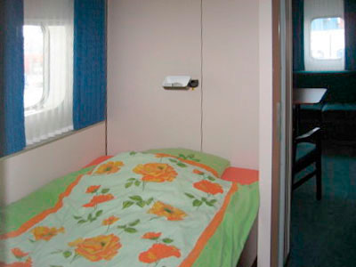 Zu den Kosten: 765 Euro pro Person, abgerechnet wird taggenau. Die Rücküberweisung für die bei uns nicht genutzten drei Tage kam prompt und ohne jedes Problem. Die Vorabinfos des Vermittlers waren gut, im Internet gabs auch genug Reiseberichte etc. Soweit die Vorgeschichte. Wir haben uns also ins Auto gesetzt, von Winnemark nach Hamburg dauert es je nach Verkehrslage zwischen knapp zwei und sechs Stunden. Wir sind mit genug Reserven losgefahren, deswegen gab es keinen Stau und sonst was. Nur mein Navi war mit der Streckenführung am Containerterminal Altenwerder ziemlich überfordert. Immerhin waren wir gut eineinhalb Stunden vor dem Anlegen unseres Schiffes am Pförtner des CTA. Die erste Auskunft dort: nee, die Henneke Rambow kommt hier nicht hin. Zweite Antwort (nach leichter Intervention): Doch, sie kommt, wir sind sogar angemeldet, nur wann sie kommt?? Wir wurden zu der Bushaltestelle des Shuttle-Busses verwiesen, ein Parkplatz fürs Auto fand sich ganz in der Nähe auf einem Parkstreifen. Nach der ersten Stunde warten bin ich wieder zum Terminal-Pförtner, dort sah man sich völlig ausserstande, mal nachzuhören, wo die Henneke denn bleibt, Theoretisch sollte sie ja schon seit 15 Uhr angelegt haben. Die Frachter-Telefonnummer war nicht zu erreichen, also mal beim Vermittler nachgefragt. Dort kam relativ prompt die Antwort, dass wir wohl so gegen 16 Uhr an Bord könnten. Und so war es dann auch. Der kleine Bus brachte uns quer durch das Containerterminal direkt vor das Schiff, ein nettes Besatzungsmitglied begrüsste uns, schnappte sich die beiden Reisetaschen und schon waren wir die auf dem Weg nach oben. Nach vier Stockwerken und gefühlten 200 Stufen (in Wirklichkeit wohl nur um die 50) öffnete sich die Tür zur Kammer, hinter der sich eine richtige kleine Wohnung verbarg. Auf den Kreuzfahrern heisst die Grösse sicher Suite mit Aussenbalkon. Hier ein paar Bilder:
