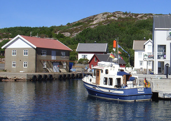 Auch nach Erreichen des Toensbergfjordes besserte sich nichts an den Verhältnissen. Rund um uns herum geiferten mit weißen Schaumkronen gekrönte Wellen, die uns vor sich her trieben. Voraus kam eine kritische Stelle. Zwischen einem Riffgebiet und der felsigen Küste betrug die Durchfahrtsbreite maximal fünfzig Meter. Mit gut acht Knoten Fahrt surften wir auf die Enge zu. Immer wenn die Wellen unter uns hindurch liefen, verlor "Molly" kurz ihre Steuerfähigkeit und schoss aus dem Ruder. Ich kurbelte wie verrückt am Steuerrad, um uns auf Kurs zu halten. Genau in der Durchfahrt befand sich unter Wasser eine Felsbarre, wo der Grund von vierzig auf rund neun Meter Wassertiefe anstieg. Die vom Skagerrak herein pressenden Wellen türmten sich dort gewaltig auf. Als wir zwischen diesen Wellenbergen hingen, konnte man glauben wir stehen auf der Stelle. Hoch aufgerichtet ragte unser Bug in den Himmel. Dann ging ein Ruck durch das Boot und wir schossen vorwärts. Endlich lag die gefährliche Enge hinter uns. Es wurde etwas besser aber bis weit in den Fjord hinein blieb die See extrem aufgewühlt. äußerst unangenehm waren die immer wieder plötzlich auftauchenden Bojen von Fischreusen. Diese konnte man oft erst dreißig bis vierzig Meter vor dem Bug erkennen.